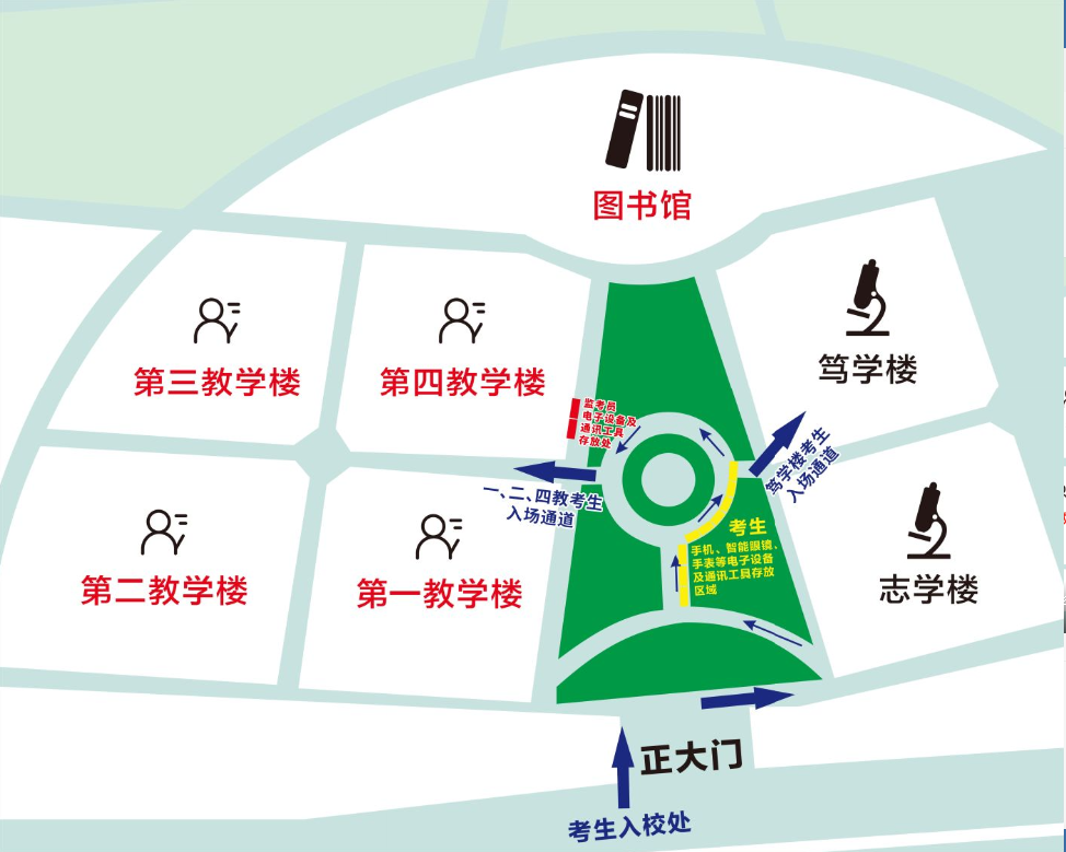 进校后,按路标提示及工作人员指引,先到指定区域存放手机、智能眼镜、智能手表等通讯设备后,到考生入口处(第一、二、四教学楼考生到第一、四教通道、笃学楼考生到笃学楼正门处)排队安检,安检通过后,方可进入考场。(特别提示:1、因考生人数较多,为避免入场拥堵,请考生提前存放,预留充足的时间等候安检进场2、请避免带包、穿戴含金属的衣物或饰品)。