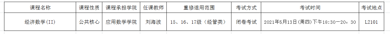 2020-2021学年第二学期《经济数学(II)》重修班考试安排如下表,请同学们查询考试时间及教室,提前半小时到考场,并携带有效证件(身份证或学生证)参加考试。