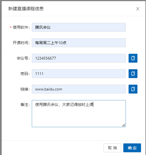 点击左侧“公告”-“直播课程信息”,在弹出的窗口输入直播课程相关信息,然后点击“保存”按钮。如使用腾讯会议,建议会议室开设为周期会议,保证会议号不变,避免后续更新。备注信息可填写QQ群号等其他需公布的上课信息。