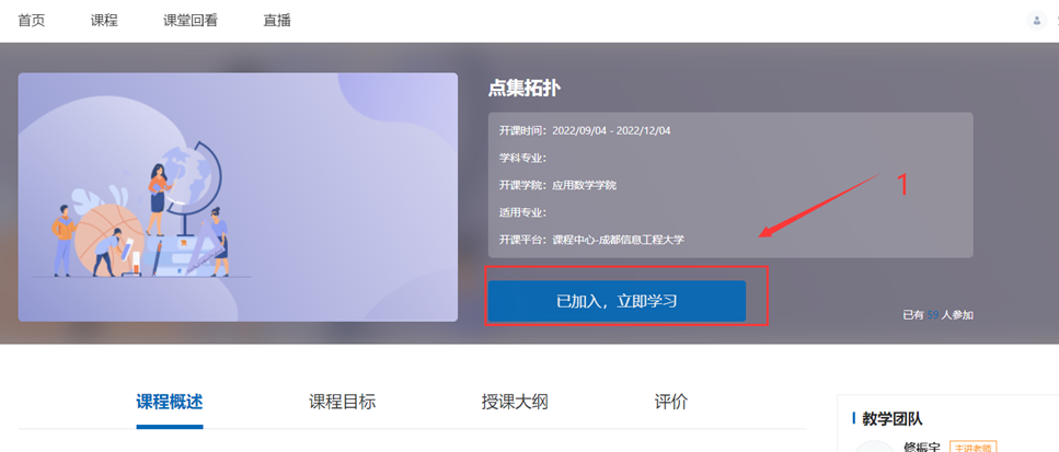 点击需要学习的课程,进入课程的详细页面,点击“已加入,立即学习”按钮,进入课程学习页面。