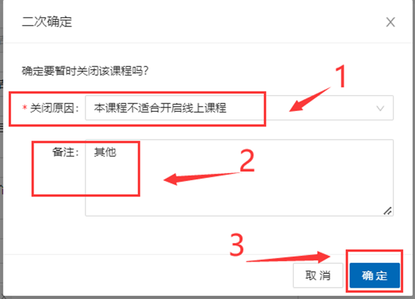 在弹出的界面添加暂不开课原因,然后点击“确定“按钮。