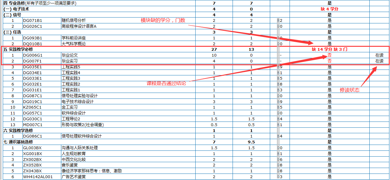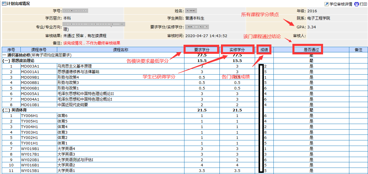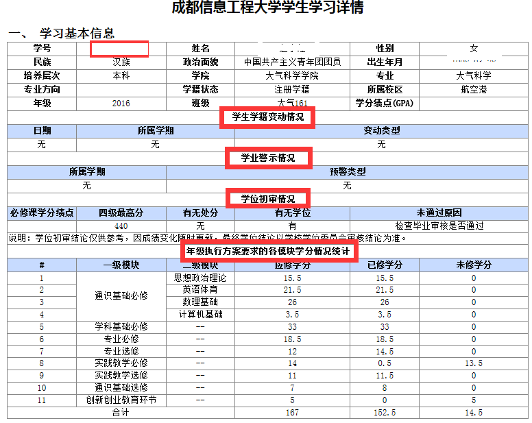 学生个人学习详情包含:学生基本信息、学生学籍变动情况、学业警示情况、学位初审情况、年级执行方案要求的各模块学分情况统计、未修及未通过的必修与核心课列表、其他记录(含CET4\6最高分,课程等价、课程免修)。