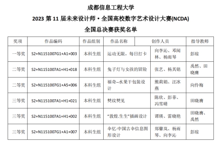 近日,第11届未来设计师·全国高校数字艺术设计大赛(NCDA)圆满落下帷幕,我校学子在本次大赛中喜获佳绩,荣获国家级一等奖1项、二等奖2项、三等奖3项;省级一等奖11项、二等奖13项、三等奖24项,吴双翼、田晓膺、向伶梅、禹然获得优秀指导教师称号。