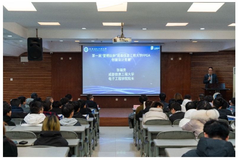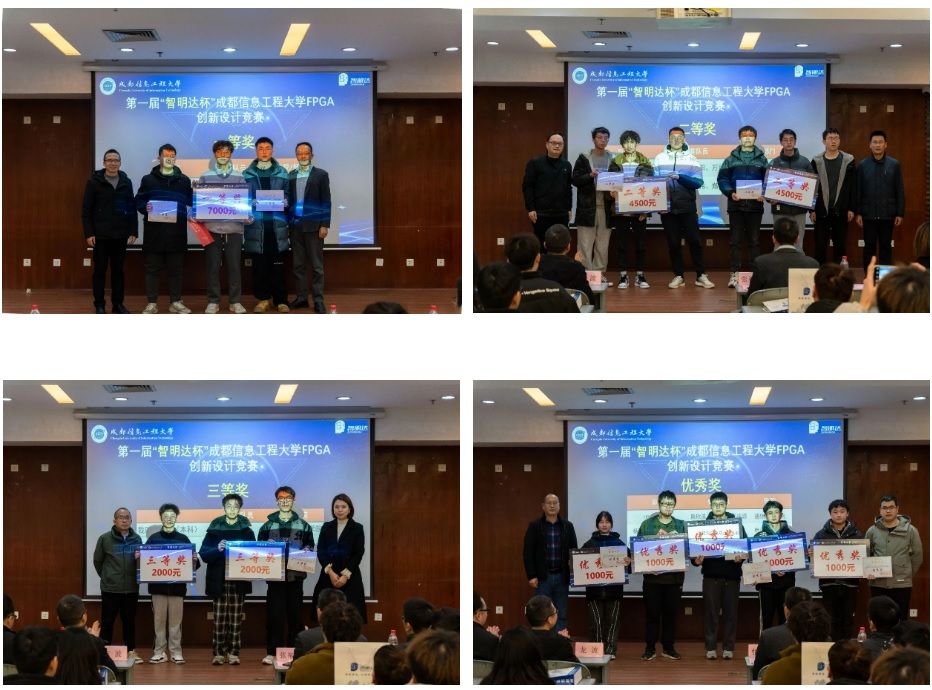 成都智明达电子股份有限公司常务副总龙波、FPGA总师刘政春、FPGA资深工程师冯宇、董君、人力资源招聘经理宿爽,我校电子工程学院、教务处、学生处相关负责人等嘉宾参加了颁奖典礼,并为获奖选手颁奖。
